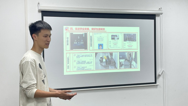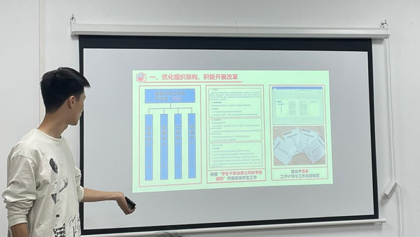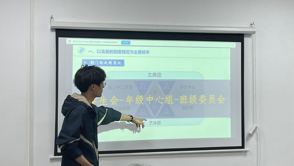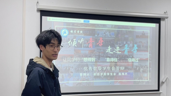 航空学院学生会主席团成员陈伟杰以《倾听青年,走进青年》为主题交流工作经验。航空学院学生会以完善的制度为主要抓手,以坚定的理想信念为重要方向,以优良的学风活力为第一要务,以全面的综合素养为最终目标,努力让同学们“想得到”,“靠得住”,“信得住”。