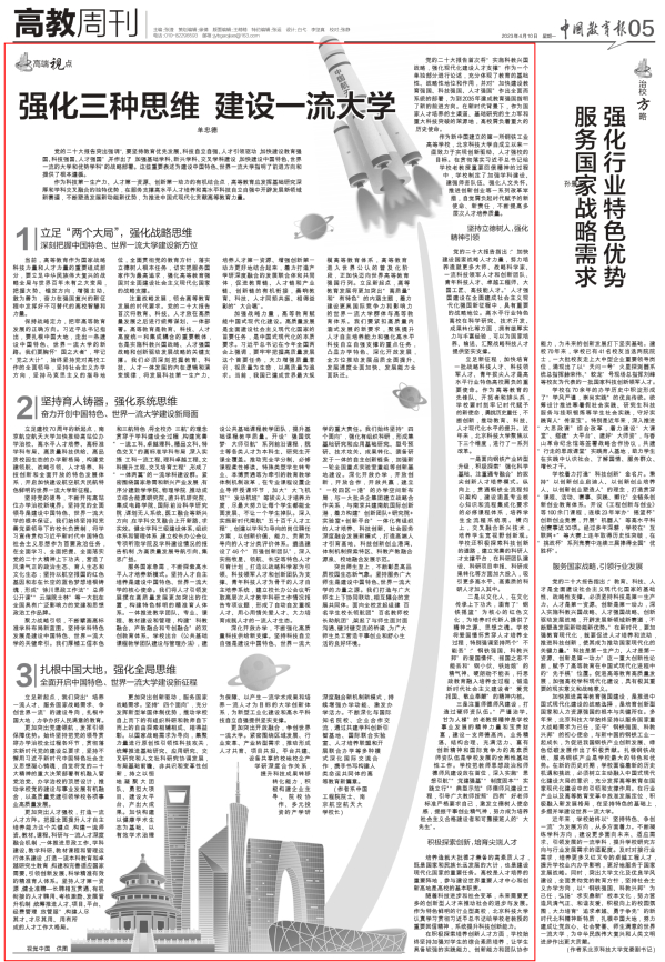 编者按:4月10日,《中国教育报》刊发校长单忠德院士署名文章《强化三种思维 建设一流大学》,现转发全文如下: