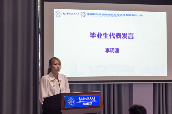 毕业生代表李玥潼回忆了四年大学生活,感恩母校培养,也表达了作为生在沈阳长在沈阳的年轻人,希望回到家乡为家乡建设添砖加瓦、为国家航发事业发展发挥青年力量的迫切愿望。