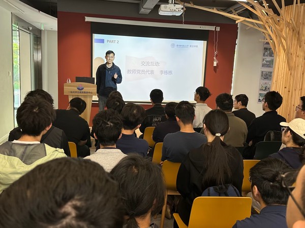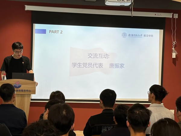 学生党员代表唐振家结合《材料力学》课程的学习分享个人体会。他提到,当他第一次接触“自主学习+精讲+深度研讨”的教学模式时便被深深地吸引,这正是任课老师们一次次“自我革命”的有效成果,这种全新的教学模式不仅能够帮助同学们高质量地掌握课程内容,更有利于启发同学们深度思考。