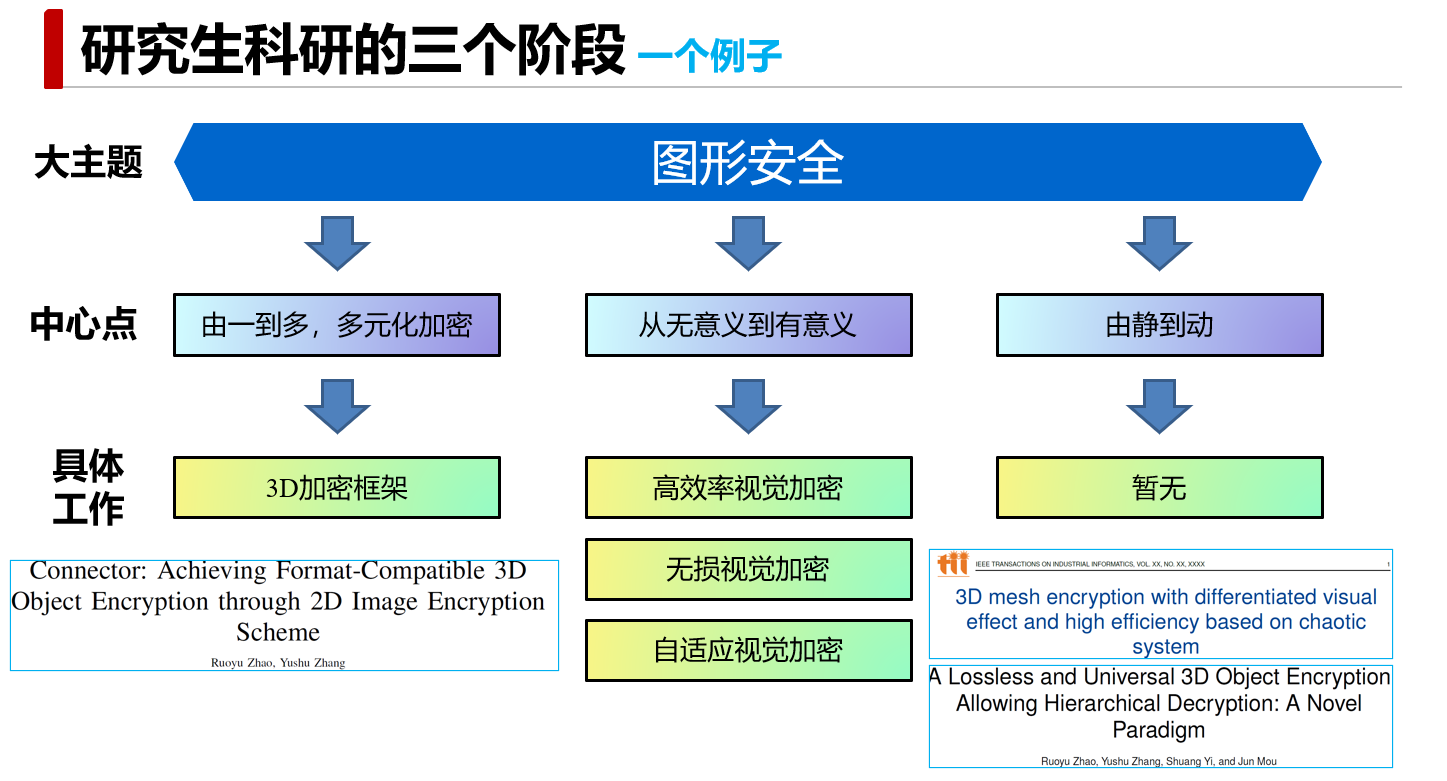 首先,赵若宇从个人科研经历入手,分享了如何有效阅读论文并从中找到自身工作突破点的方法。他还以自身工作为例,介绍了初探期、发展期、聚焦期三个研究生科研不同阶段的工作重点。