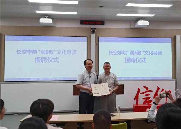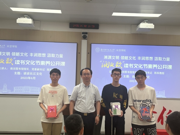 现场还举行了长空学院“润&致”文化导师授聘仪式和赠书仪式。长空学院常务副院长蒋彦龙为南京图书馆馆长陈军教授颁发“润&致”文化导师聘书,希望以此为纽带,加强对长空学院文化建设的指导,充分发挥大学者的关键性、持久性引领作用,推动长空学院与南京图书馆阅读基地共建迈上新台阶。陈军馆长为长空学院学生现场赠送书籍,勉励同学们做“爱读书”“读好书”“善读书”的新时代人。