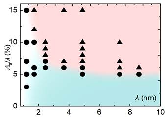 图2. 周期性起伏基底上的“相图”。横坐标为起伏的波长,纵坐标是起伏度和波长之比。背景中的红色、白色和青色分别对应缺陷、悬空和贴合形貌。