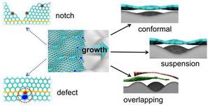 图1. 石墨烯在周期性起伏的基底上的生长示意图(中央),几种典型的形貌:缺口、贴合、悬空、叠层、缺陷(沿顺时针方向)。