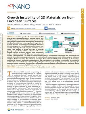 近日,我校前沿院团队在探索二维材料曲面生长的基本规律方面取得重要进展,他们发现,二维材料在周期起伏的基底上生长会产生多种与失稳相关的生长形貌。该研究以“Growth Instability of 2D Materials on Non-Euclidean Surfaces”为题作为cover paper发表在国际纳米期刊《ACS Nano》上,第一作者是南京航空航天大学讲师胡知力,通讯作者为张助华教授,共同作者还包括薛敏珉博士、郭万林院士以及美国Rice大学的Boris Yakobson教授。