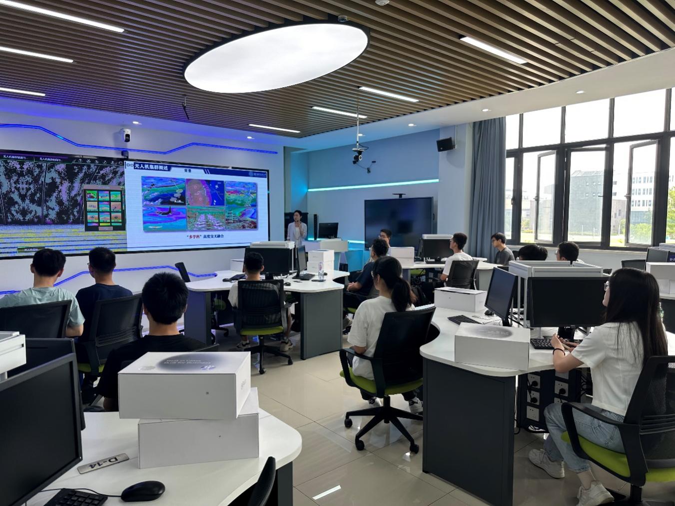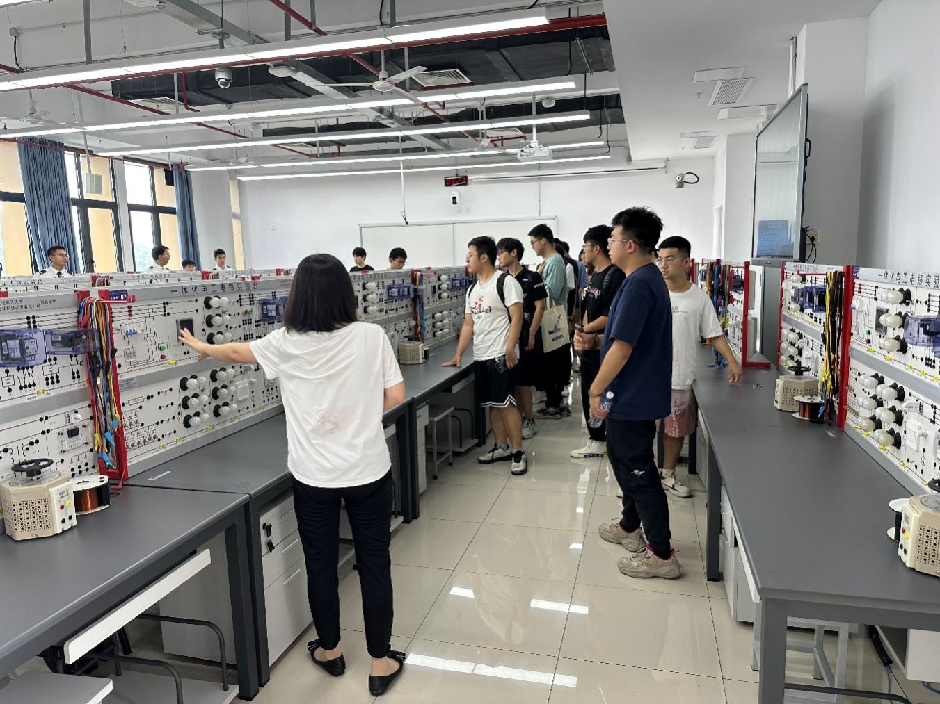 参观体验环节,电工电实验教学中心主任黄晓晴为学生代表讲解了各实验室设备设施、课程设置、开放运行等情况,虚拟仿真实验中心党支部书记王心一组织同学进行多旋翼无人机装配与群体协同虚拟仿真课程体验。