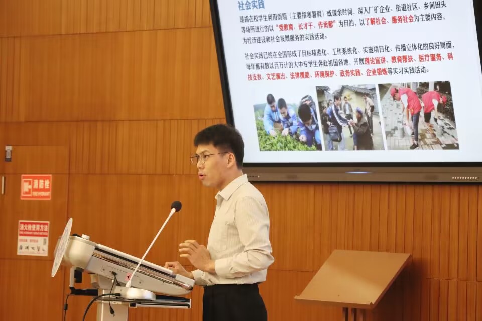 孙明智从落实习近平总书记关于青年工作的重要思想出发,为同学们阐述了社会实践是什么、为什么要做社会实践两个问题,根据社会实践的选题类别举出相应优秀社会实践团队的典例为大家详细讲解实践要点,对应分析实践重点,帮助同学们更清晰地了解社会实践应该如何开展。