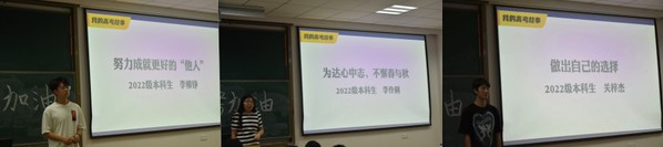 在“我的高考故事”分享环节,三位同学以朴实动人的话语,讲述了自己的高中的故事。李柳铮讲述着自己的高考动力来自于想通过自己努力让身边人过得更好的决心。每当遇到迷茫和困难时,这份初心都会在内心深处为他加油打气。李伶俐同学讲述了自己“为达心中志,不懈春与秋”的故事,因缺乏自制力导致成绩滑坡后,不甘落后的她奋起直追,最终一点点的将自己失去的意志力和良好学习习惯拾起来。关梓杰同学回忆了自己在高三时候做的重要选择:不能继续昏沉下去,要清醒起来,这段经历让他对选择有了更深理解:选择本身就是自我改变的开始!