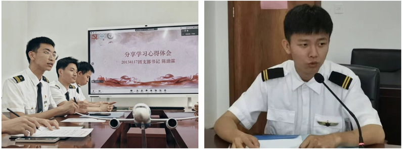中国民航大学飞行分校20134117团支部书记陈渤霖、通用航空与飞行学院2021级团总支书记陈衍甫结合自身学习成长经历,分别围绕思想引领、理论学习、班团建设等方面分享了自身心得体会,认为飞行学生应该把爱国之情、强国之志、报国之行融入到党和国家事业发展之中,练就过硬本领,养成优良作风,努力成为“一专多能”的民航高素质飞行人才。
