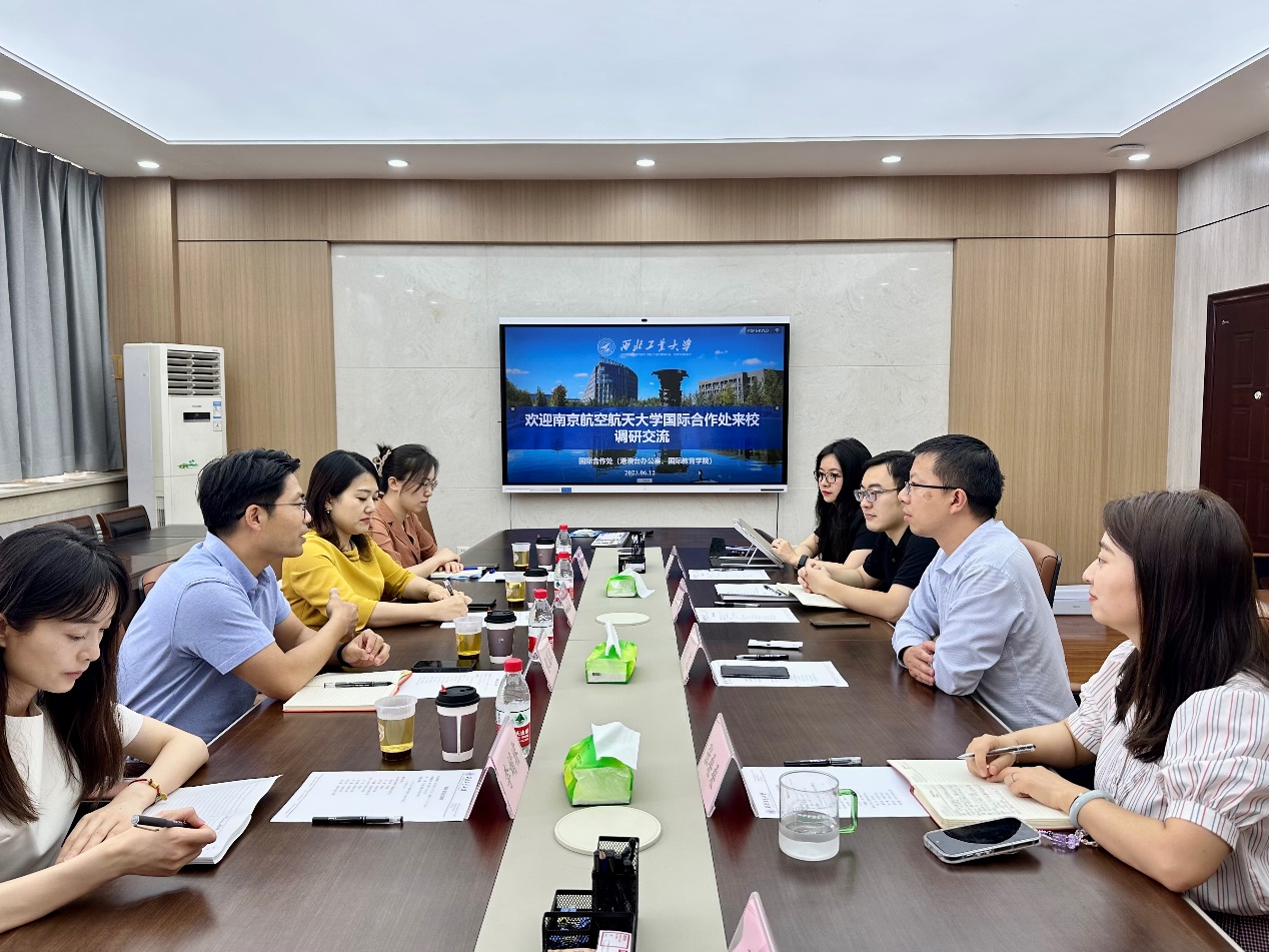 6月12日下午,我校国际合作处副处长张国权、沈敏一行前往西北工业大学国际合作处调研。西北工业大学国际合作处副处长陈俊及相关负责同志参加调研交流。会议由陈俊主持。