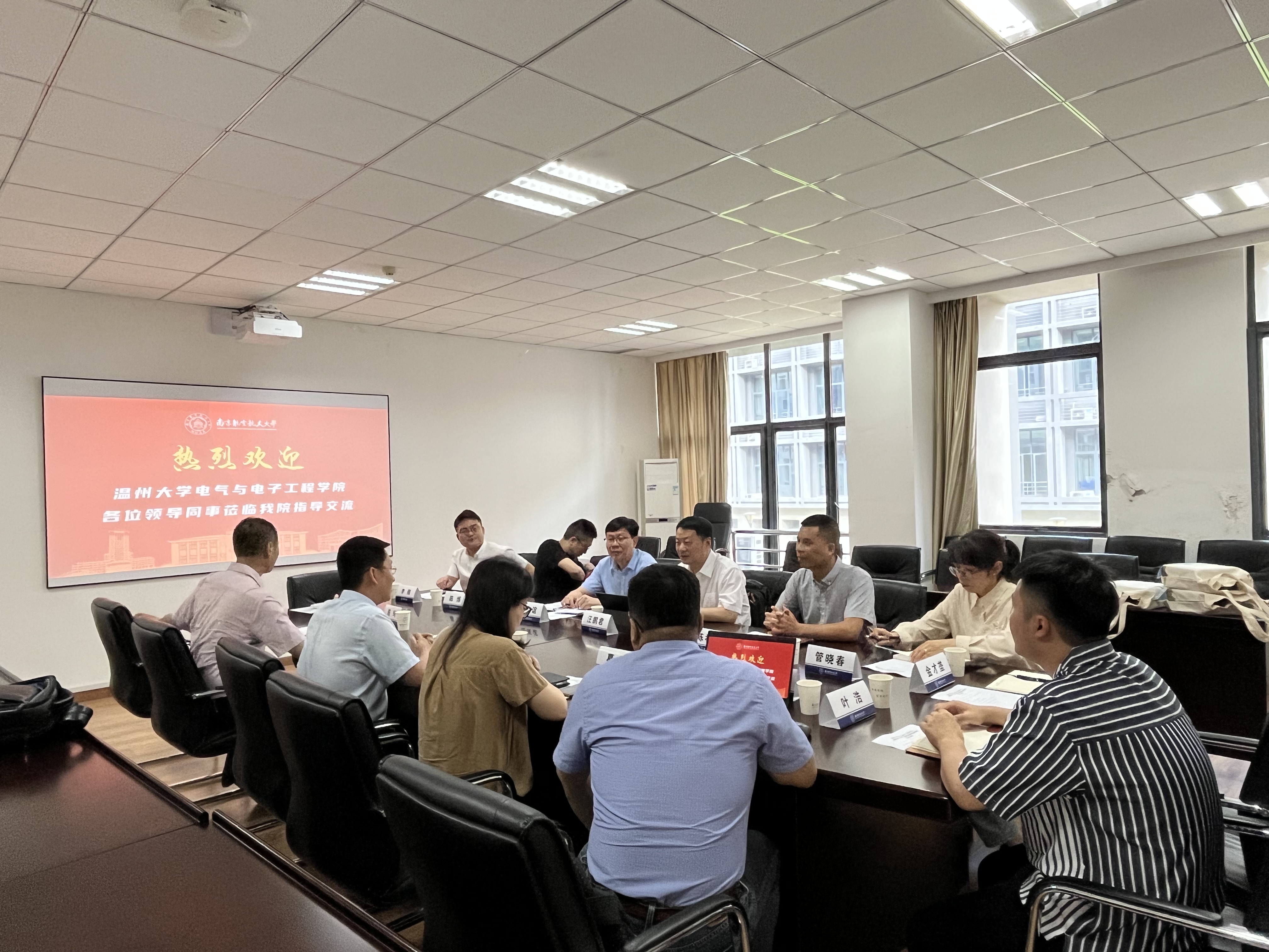 刘伟强热烈欢迎汪鹏君一行到访,并介绍了学院的基本情况以及近年来在近年来在集成电路学科建设和人才培养等方面取得的进展和成果。汪鹏君则介绍了温州大学电气与电子工程学院在师资队伍、科研平台、学科体系和集成电路专业建设等方面的情况。随后,陈鑫详细介绍了学院在微电子科学与工程专业的本科培养方案、课程设置、实验室建设和专业特色等方面的情况。双方还就学生实践安排、教学软件使用以及其他关心的专业建设问题进行了深入的交流。