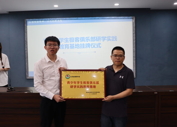 杨福松首先代表溧阳中学对计算机学院、极客俱乐部成员的到来表示欢迎,感谢学院对溧阳中学人才培养的支持。他希望以此为契机,进一步深化校地合作,引导学生全面成长成才。胡朋代表学院感谢溧阳中学的大力支持,并希望继续加强合作,联建更多的校地共赢平台。随后,胡朋、杨福松共同为江苏省溧阳中学“青少年学生极客俱乐部研学实践教育基地”揭牌。