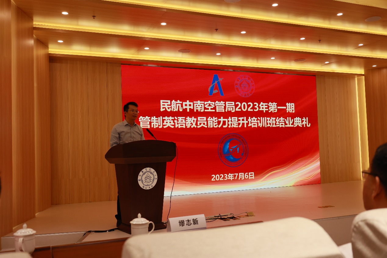在结业典礼上,廖超豪对学校的大力支持表示衷心的感谢,并提出了三点希望:一是希望各位学员能总结归纳、学以致用,密切配合原单位的“三年行动计划”开展管制英语通话能力提高培训;二是希望各位学员持续学习,保持高水平的英语听说能力,拓展眼界、多看世界,切实提高解决问题的能力;三是希望各位学员勇于奉献、敢于担当,担起管制英语培训的责任,克服畏难情绪,用心探索、实践,切实领悟这件事对中南空管高质量发展的意义。