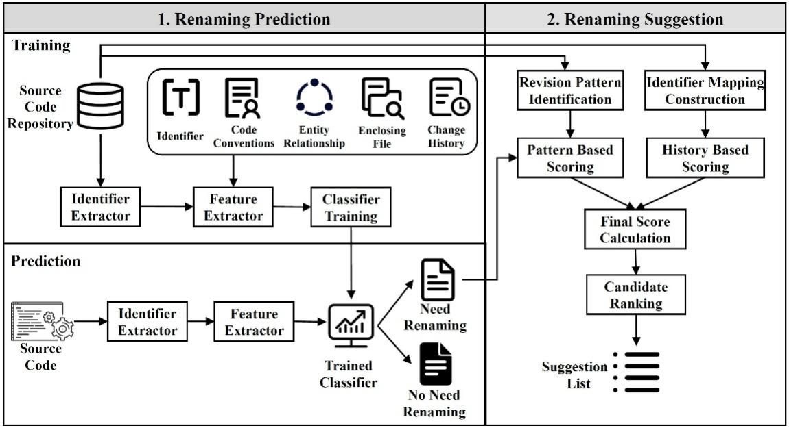 论文《An Accurate Identifier Renaming Prediction and Suggestion Approach》提出了一种新的全粒度标识符重命名预测和建议方法。标识符在帮助开发人员分析和理解源代码方面发挥着重要作用。然而,在实际软件项目中存在大量与相应的编程规范或语义功能不一致的标识符。因此,标识符需要定期重命名。该方法首先从标识符中提取一系列特征,以捕获标识符与编程规范以及相关代码实体之间的关系等。这些标识符特征及其重命名历史用于训练分类器,该分类器可用于预测给定的新标识符是否需要重命名。随后,基于具有相似模式和重命名序列的相关代码实体共同演化的原理,为这些标识符推荐一系列新标识符。实验结果表明,该方法识别需要重命名的标识符的平均F1值接近90%。此外,该方法在建议正确标识符方面比现有最好方法高出15.75%。该论文已被CCF A类国际期刊TOSEM录用,第一作者为张静宣副教授。