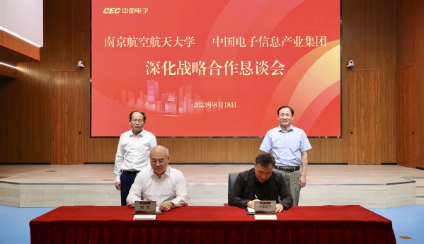 8月18日,南京航空航天大学与中国电子信息产业集团有限公司(以下简称“中国电子”)在深圳举行深化战略合作恳谈会,双方围绕共建集成电路学院和大数据研究院进行深入交流并签署合作备忘录。会前,中国电子党组书记、董事长曾毅会见校长单忠德院士一行。中国电子党组副书记、总经理、董事李立功,党组成员、副总经理陆志鹏,我校副校长黄志球,校长助理、党政办公室主任张启钱参加恳谈会。