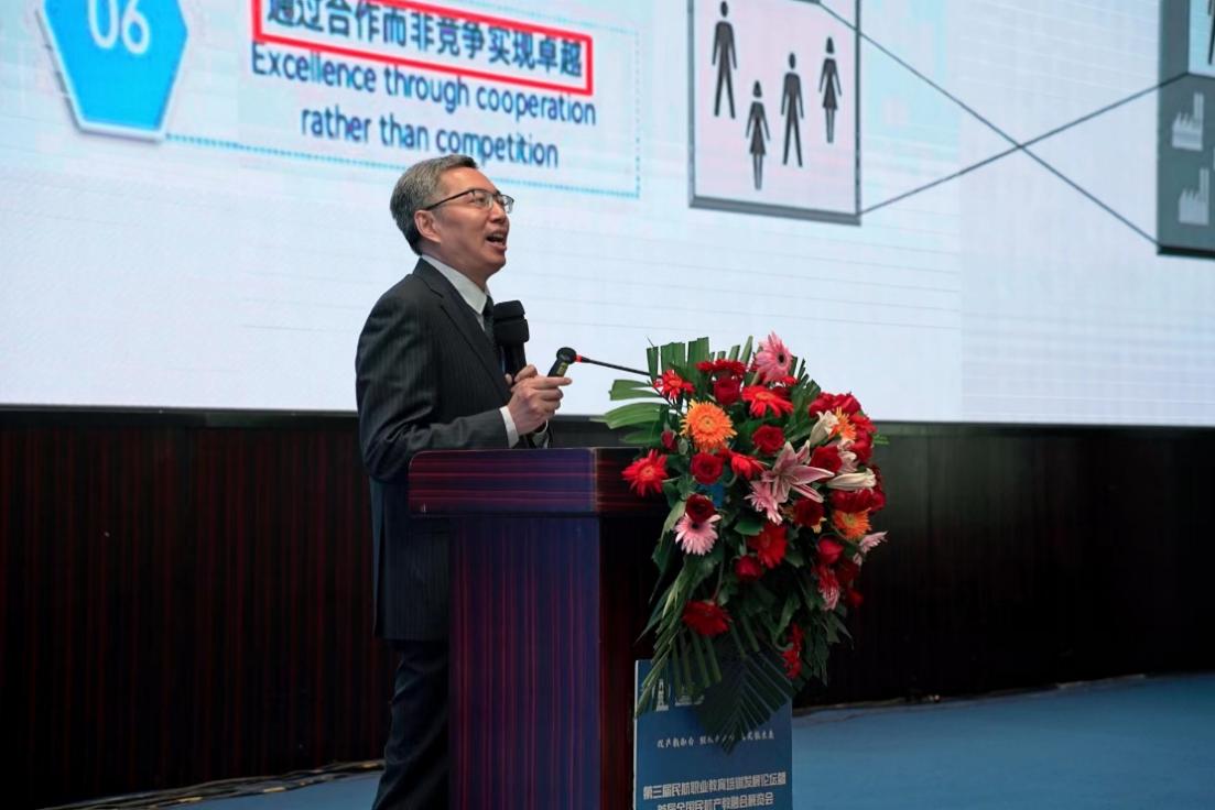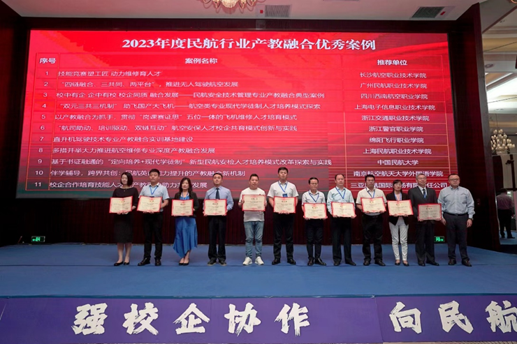 在“第三届民航职业教育培训发展论坛”召开前,中国航空运输协会征集了2023年度民航行业产教融合典型案例。外国语学院报送的案例“伴学辅导,跨界共创:民航英语能力提升的产教融合新机制”荣获“产教融合优秀案例”称号。中国航空运输协会常务副理事长潘亿新为获奖单位颁奖,王孝存代表团队领奖。