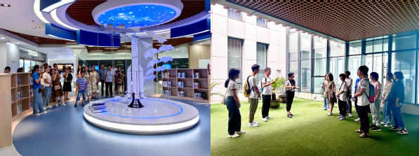 在将军路校区图书馆的参观中,二楼大厅背景墙“航天梦”雕刻着充满科技感和未来感的飞行器、空间站等画面,让前来参观的学生感受到我校航空报国的使命担当,激发出“飞天的梦想从这里起航”的决心。共享空间的参观让学生、家长感受到舒适、自由的学习氛围。图书馆的“空中花园”仿佛是隐藏在书海中的世外桃源,充满了生机与活力。新书库的参观,让学生、家长了解到图书馆丰富的资源建设,感受到浓厚的学习氛围。本次参观还特别开放“智慧阅读体验空间”,让学生在阅读、学习之余,能缓解压力、加深科学探索,是未来智慧图书馆的一个缩影。