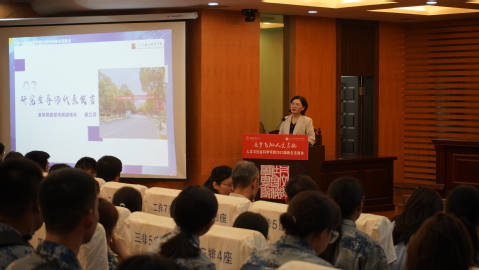 班主任代表季洁和研究生导师代表杨兰芳、许汉泽为新生们送上“大学和研途攻略”。他们结合自身的科研和学术经历,以亦师亦友的身份与同学们进行沟通交流,鼓励同学们培养爱读书的好习惯、保持健康的生活方式、建立良好的人际关系,度过美好、充实的校园生活。