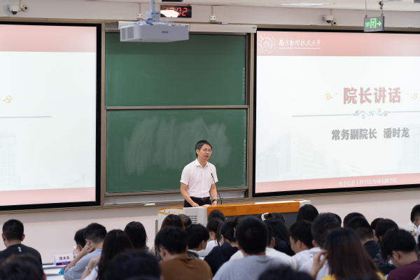 学院常务副院长潘时龙代表学院全体师生对345名研究生新生的到来表示热烈的欢迎,他结合二十大报告及习近平总书记江苏考察重要指示精神,勉励同学们要立志在电子信息领域有所作为。他向同学们提出了三点希冀,一是要志存高远,服务国家需求。二是要敢于突破,培养创新思维。三是要求索不止,锤炼奋斗精神,用实际行动将“经纬天地,慧通时空”的四院精神传承、发扬。他在致辞中以学院优秀博士毕业生张博文主动选择赴国防单位就业的故事为例,鼓励新生聚焦国家所需,着眼重大战略,把勇于创新,奋勇争先的精神内化于心,为科技强国注入澎湃的青春动能。