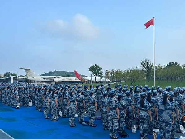 2023级本科生袁奕作为新生代表进行国旗下讲话。袁奕回首了过往几天的军训生活,欣喜于同学们的坚韧与顽强。她表示作为南航学子,要有“效法羲和驭天马,志在长空牧群星”的豪情壮志,向着未知的宇宙不断探索,发现真理,做积极进取的南航人。