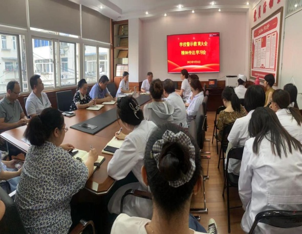 9月8日下午,校医院召开了2023年下半年学校干部教师大会和全校警示教育大会精神传达学习会,及时组织医院广大党员干部和医务人员认真学习学校2023年下半年干部教师大会和全校警示教育大会精神。医院全体党员、入党积极分子、中层以上干部以及员工代表参加了会议。会议由医院直属党支部书记、院长刘协和主持。