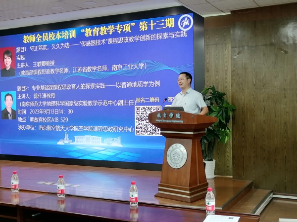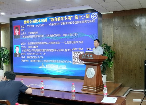 为进一步贯彻实施《高等学校课程思政建设指导纲要》,全面推进我校课程思政建设,发掘和强化各类课程的育人功能,提升教师课程思政水平,航空学院课程思政研究中心举办了教师全员校本培训“教育教学专项”第十三期培训活动。本次活动中,南京工业大学教授王轶卿和南京师范大学教授陈仕涛做了专题讲座。教师发展与教学评估中心主任朱建军代表学校致欢迎词,强调了南航对课程思政工作的高度重视,希望高校教师尤其是青年教师树立课程思政育人理念,要深刻认识每一门课程,形成课程思政育人自觉,全面提升教师的课程思政能力。航空学院副院长陆洋代表学院发表讲话,希望通过本次活动加强教师课程思政能力建设,提升课程思政元素挖掘能力和课程思政教学组织能力。全校各个学院的60余名教师参加了本次活动。本次活动由彭瀚旻主持。