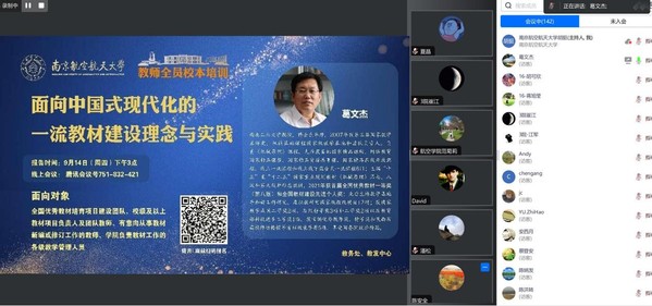 为落实新时代教材建设的新要求,提升教师的教材编写能力,9月14日下午,我校邀请首届全国优秀教材一等奖获得者、全国教材建设先进个人、西北工业大学教授葛文杰做题为“面向中国式现代化的一流教材建设理念与实践”的线上报告会。报告会由教务处副处长李晋斌主持,全国优秀教材培育项目建设团队、校级及以上教材项目负责人及团队教师、学院负责教材工作的各级教学管理人员等140余人参会。