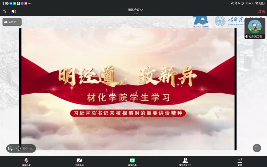 首先,参会人员共同学习习近平总书记在哈尔滨工程大学考察时的重要讲话精神。哈尔滨工程大学材料科学与化学工程学院李佳明分享道:“作为工信七子,我们要践行军工精神,把忠诚刻进基因、融入血脉、化作行动,紧贴强国强军需要,积极担当作为,为实现强军梦贡献自己的力量。”