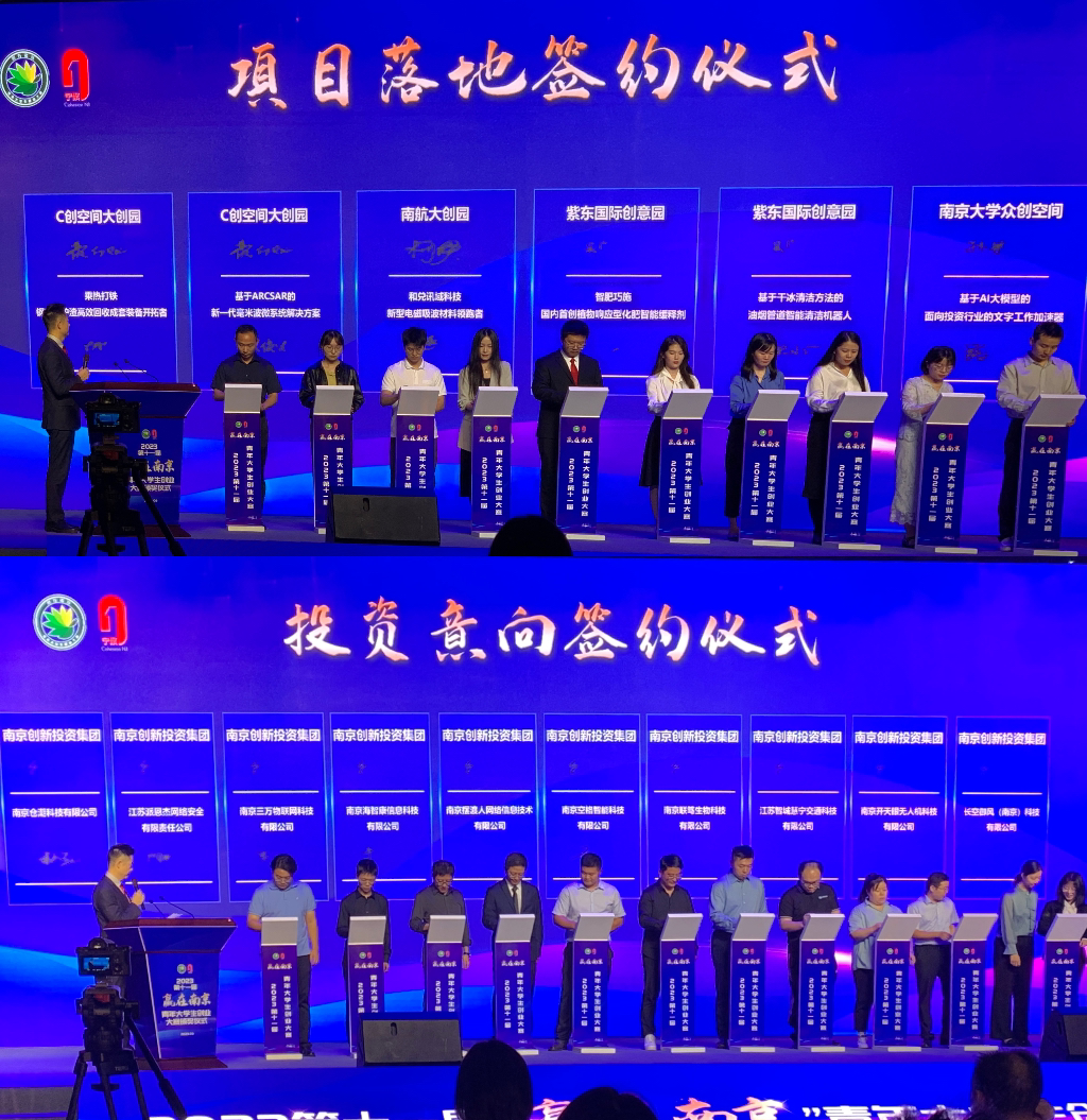 仪式上,我校大学生创业园与王燊旭进行项目落地意向签约,后续项目将入驻园区由大学生就业创业指导服务中心孵化发展。大创园在孵企业长空御风(南京)科技有限公司与南京创新投资集团进行微接力投资项目意向签约。