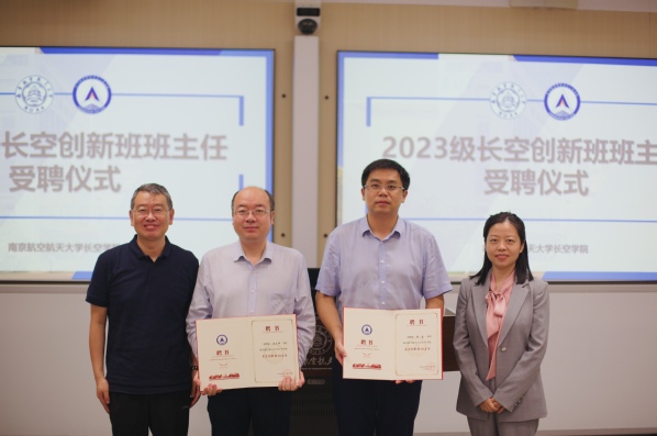 随后,蒋彦龙、彭聪为2023级长空创新班班主任颁发聘书。班主任以自身求学科研经历勉励新同学们扎实学习基础知识、塑造独立人格、磨炼坚韧心智、厚植家国情怀,将“个人梦”融入到民族复兴的“中国梦”,赓续红色基因,成就蓝色梦想。