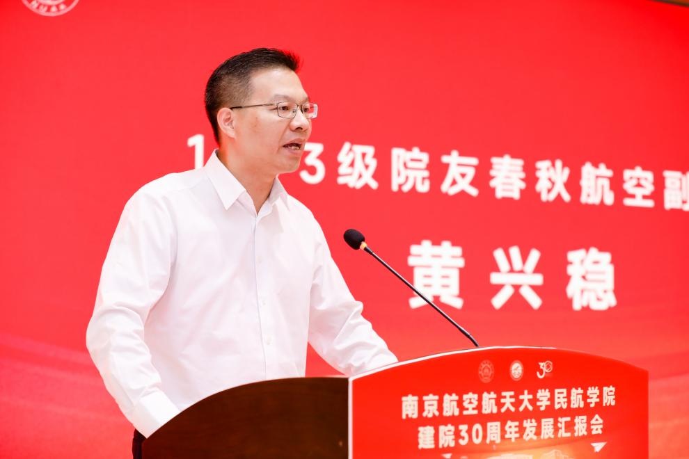 黄兴稳作为民航学院院友代表致辞,他回忆了自己与母校的缘分渊源和在民航学院的求学经历,对于民航学院的栽培表达了深切的感恩之情,并为民航学院送上真挚祝福,祝愿民航学院抓住新时代民航发展的重大机遇,乘势而上,早日建设成特色鲜明的世界一流民航学院。