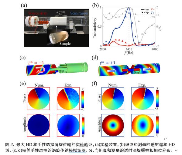 本工作通过将非厄米EP引入相位梯度超构表面(phase gradientmetasurfaces, PGMs),揭示并验证了实现最大HD的新现象和物理机制。通过在PGMs中引入局域损耗调制用以获得手性EP,本工作利用PGMs系统中的异常衍射机制来操控轨道角动量,并证明了非厄米PGMs所携带的内禀拓扑荷与手性相反的入射涡旋场之间存在极端非对称耦合,具体表现为:一种手性的涡旋波被完全反射,而相反手性的涡旋波被完全吸收,从而实现最大的HD(图1)。此外,通过利用相干完美吸收-激光的概念,该手性EP原理被进一步拓展至非厄米PGM的无损模型。由于继承了非厄米PGM奇异点所诱发的非对称手性耦合特性,无损PGM可以通过灵活地设计来实现多样化的极端手性调控:一种手性的涡旋场被无损PGM完全反射,而相反手性的涡旋场则可以传输并转化为定制的涡旋模式,这为研究最大螺旋二色性和操控手性模态提供了新机遇。比如,作为最大螺旋二色性的一种体现,本工作首次提出了完美手性选择的涡旋传输现象(图2),并通过声学实验进行了验证。