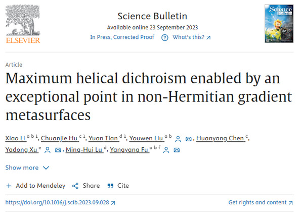 近日,物理学院应用物理系教授伏洋洋、刘友文和苏州大学教授徐亚东等人合作,通过在非厄米梯度超构表面中构建手性奇异点,提出了一种实现最大螺旋二色性的新现象和物理机制。相关成果以“Maximum helical dichroism enabled by an exceptional point innon-Hermitian gradient metasurfaces“为题在线发表在综合性国产领军期刊《ScienceBulletin》上(中科院1区TOP, IF:18.9)。伏洋洋、刘友文、徐亚东为该工作的共同通讯作者;南京航空航天大学博士生李潇、厦门大学博士生胡传捷和南京大学博士生田源为共同第一作者;南京大学教授卢明辉和厦门大学教授陈焕阳对该工作研究作出重要指导。