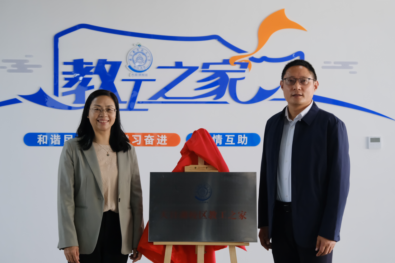 在热烈的掌声中余春玲与王伟华共同为天目湖校区“教工之家”揭牌。