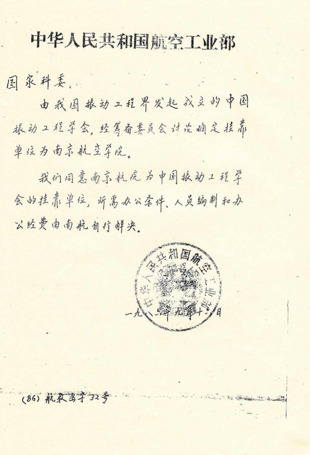 中国振动工程学会成立于1987年5月,是中国科学技术协会主管的国家一级学会。20世纪80年代中期,胡海昌院士等专家首先提出了振动工程的概念。他和茅以升、李国豪、钱令希、刘恢先、王仁、常迥及我校张阿舟、丁锡洪、朱德懋等60余位国内著名专家学者共同发起成立中国振动工程学会。经筹备组对挂靠单位的遴选,1986年中国航空工业部以航教函字32号文件致函国家科委,同意我校作为中国振动工程学会的挂靠单位。目前学会设立模态分析与试验、非线性振动、随机振动、故障诊断、机械动力学、转子动力学、动态测试、动态信号分析、振动与噪声控制、结构动力学、航天器振动与控制、磁悬浮技术与振动控制、人因振动工程、动力学载荷与设计等19个专业委员会;共有个人会员14000余人,单位会员50余家;每年举办包括“振动工程国际学术会议”“全国振动理论及应用学术会议”“全国随机振动理论与应用学术会议”“全国转子动力学学术大会”“全国振动与噪声高技术应用学术会议”等国内外学术会议30余场;主办《振动工程学报》《振动与冲击》和《岩土工程学报》等著名学术刊物;开展中国振动工程学会科学技术奖评选,青年人才托举等各类活动。为学校力学、航空宇航科学与技术等学科发展、人才引进与培养、学术交流做出了积极贡献。