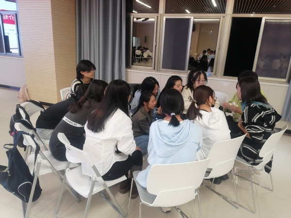 培训的第二环节为团体辅导,主题为“快乐相逢”,由陈瑜带领,心理健康教育中心多位兼职老师担任助手。首先,陈瑜通过趣味接龙、放松按摩的活动,帮助同学们放松身心、提高专注度,现场气氛轻松愉悦。接着,全体同学被分为9个小组,由兼职老师分别进组带领。心理委员们通过滚雪球、相似圈的活动,加深了对自我和其他成员的认识,找到了彼此的共同志趣和情感联结;又在心有千千结、信任圈的活动中,体会到了自己在沟通、信任、合作中的优势与局限,学习到了提高团队凝聚力的方法和技能。