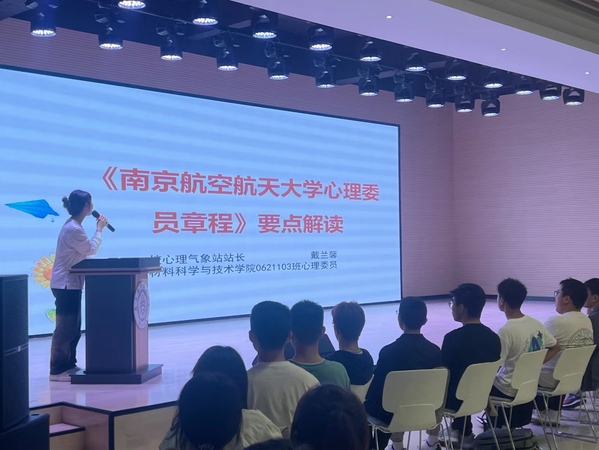 接着,校心理气象站站长戴兰馨同学对《南京航空航天大学心理委员工作章程》进行了重点解读,介绍了我校心理委员的组织架构、胜任条件、权力、义务、职责等具体内容。第五届全国百佳心理委员获得者张浩宸同学,做优秀心理委员经验分享,结合自身分享了如何关注同学心理状况、如何支持帮助有问题的同学、如何开展班级和校级心理活动的经验。最后,陈瑜老师就“团体辅导技术在新生班级凝聚力建设中的应用”进行了知识讲解。