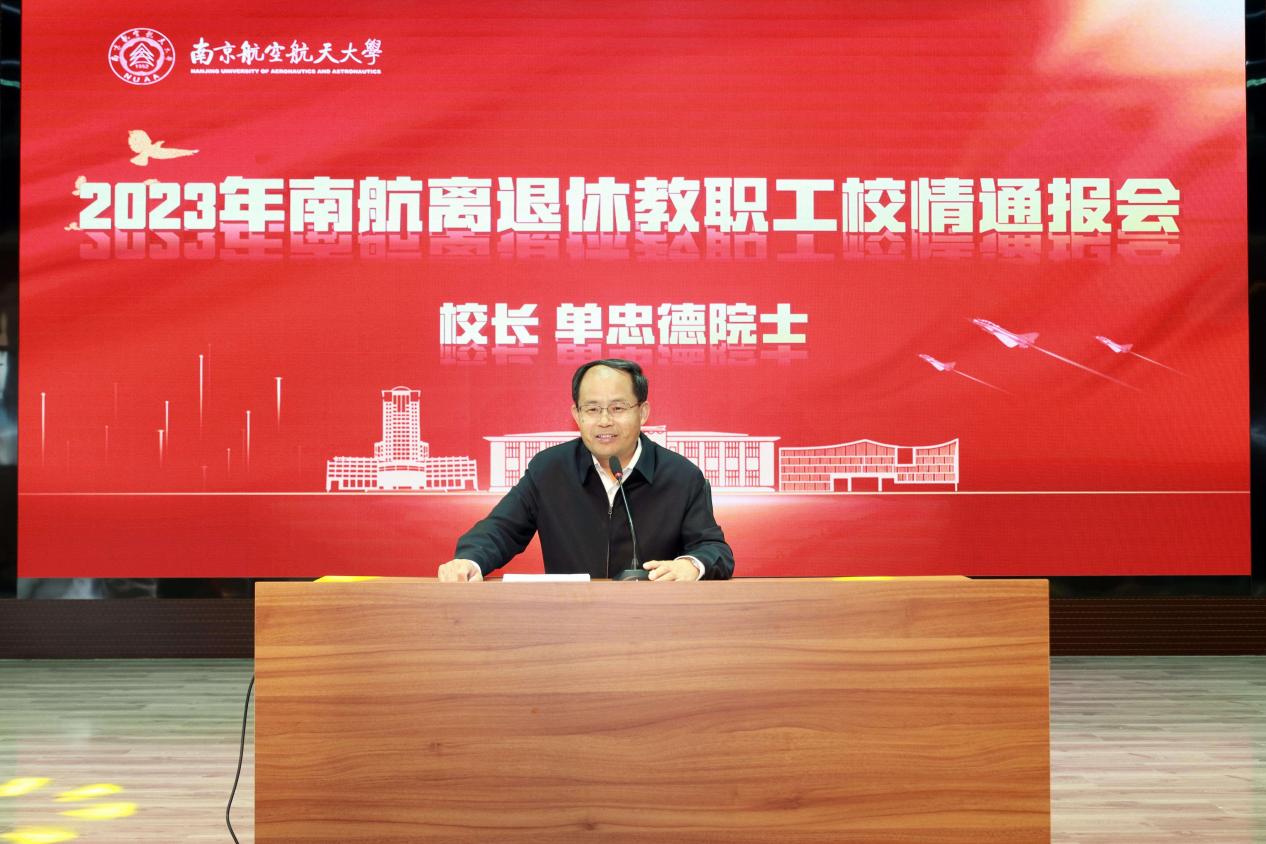 会上,单忠德代表郑永安书记和学校党政领导班子向各位老领导、老同志们致以最诚挚的问候和重阳节的美好祝愿,向大家长期以来对学校事业发展的关心支持和指导帮助表示崇高的敬意和衷心的感谢。单忠德全面通报了学校2023年上半年在党的建设、学科建设、人才培养、科学研究、校园治理等方面所取得的新成绩、新进展、新突破,介绍了下半年及今后一段时期学校改革建设的重点工作和关键任务。他指出,离退休教职工是学校的宝贵财富,是学校高质量、系统性、国际化发展的重要支撑,全校上下要深入贯彻落实习近平总书记关于老龄工作的重要指示精神,全心全意、用心用情做好各项服务保障工作,竭尽全力为老同志们做好事、办实事、解难事,进一步营造好尊老、敬老、爱老、孝老的良好氛围,让大家共享学校事业改革发展的成果。希望老同志们一如既往关心支持学校的建设发展,继续发挥政治优势、威望优势和经验优势,为一流南航、美好南航、幸福南航建设贡献更大智慧和力量。