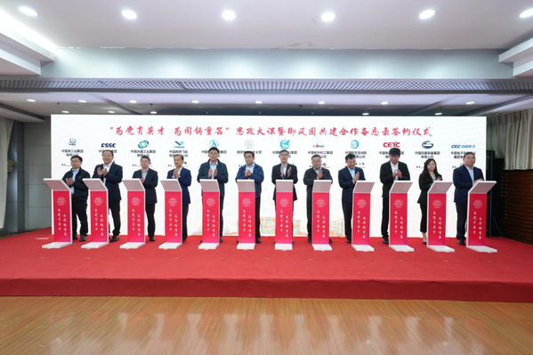 学校与中国航空工业集团有限公司、中国航天科技集团有限公司、中国航天科工集团有限公司、中国商用飞机有限责任公司、中国航空发动机集团有限公司、中国兵器工业集团有限公司、中国电子科技集团有限公司、中国船舶集团有限公司、中国兵器装备集团有限公司、中国核工业集团有限公司、中国电子信息产业集团有限公司等11家集团公司签署“为党育英才 为国铸重器”思政大课暨御风园共建合作备忘录。