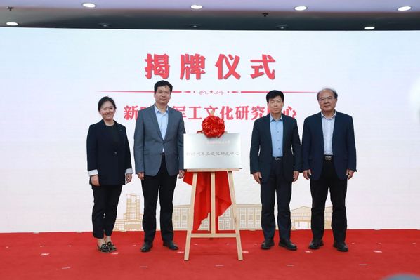 赵荣贵、蔡金曼、姚远、郑永安共同为“新时代军工文化研究中心”揭牌。