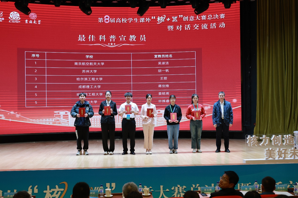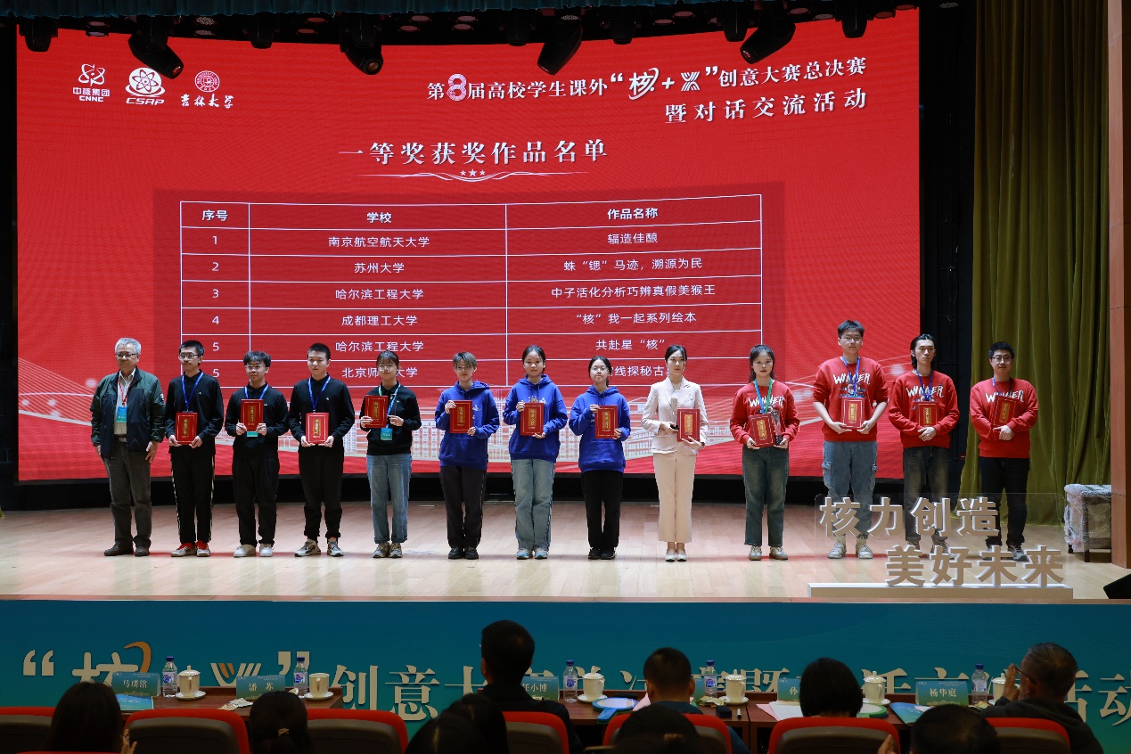 全国高校学生课外“核+X”创意大赛是由中国辐射防护学会和教育部高等学校核工程类教学指导委员会共同发起核科学与技术一级学科领域唯一的全国性学科知识类竞赛。本届大赛得到人民日报、中国日报网、中国新闻网、中国青年网、今日头条、中国环境报、中国核工业报等10余家主流媒体的广泛关注。通过中核集团视频号、微博、抖音、快手、百家号,中国辐射防护学会视频号等多个媒体平台同步直播,观看人次超过110万。中国科协科普部副处长刘鑫、教育部高等学校核工程类专业教学指导委员会秘书长王学武、中核集团宣传文化中心副主任孙敏莉、国家核安全局辐射源安全监管司处长朱培、国家原子能机构新闻中心采编处处长李元龙,与来自全国30余所高校、12家学会、400余个协会参加了本次活动。本届大赛共76所高校学生报名参加,通过高校初评、省级赛评选推荐至学会视频类作品276件,文字类作品17件。经组委会专家初审、终审,评选出前三等奖作品87件,决赛现场评选出二等奖作品23件,一等奖作品6件。
