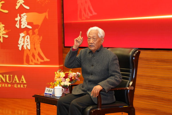 揭幕仪式后,方祖岐为在场师生带来题为《我从抗美援朝战场走来》的报告。方祖岐从抗美援朝的历史意义、奋战过程和亲身经历三个方面展开交流。方祖岐回忆道,参加抗美援朝战争,是其一生中最荣幸的事。负责志愿军装甲兵指挥所的机要通信任务的他,透过一道道电波,“认识”了许多伟大的志愿军英模,听到了无数英勇奋战、可歌可泣的英雄故事。方祖岐表示,敌我在武器装备上的差距是巨大的,赢得战争靠的是血肉之躯、爱国主义情怀和对党的信仰,他勉励在场学生要敢于挑战自我,为中华民族伟大复兴贡献自己的一份力量。