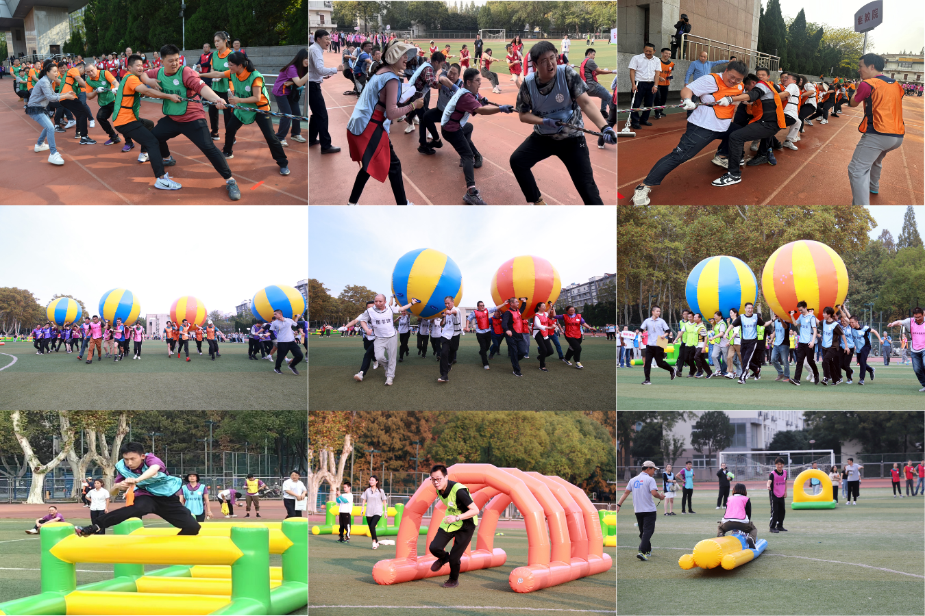 本次趣味运动会共设“力拔山河”、“运转乾坤”、“勇往直前”三个项目,所有项目均为团队项目,这些项目既是智慧和体力的较量,又是团结与协作的比拼。运动场成为一片欢乐海洋,运动员们精神抖擞,斗志昂扬,观众们的加油声、喝彩声、欢笑声此起彼伏,每个人的脸上都洋溢着轻松、愉悦的神采,在绿荫场上尽情享受运动带来的快乐。为组织好此次运动会,校、院两级工会干部尽全力为运动员们做好各项安全服务保障工作。