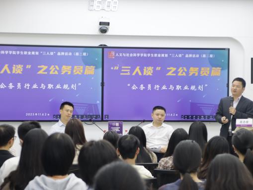 11月2日,人文与社会科学学院在院楼213智慧教室举办“三人谈”品牌活动(第二期)——“公务员篇”,院长高志宏、两位在职公务员共同与同学们探讨“公务员行业与职业规划”。