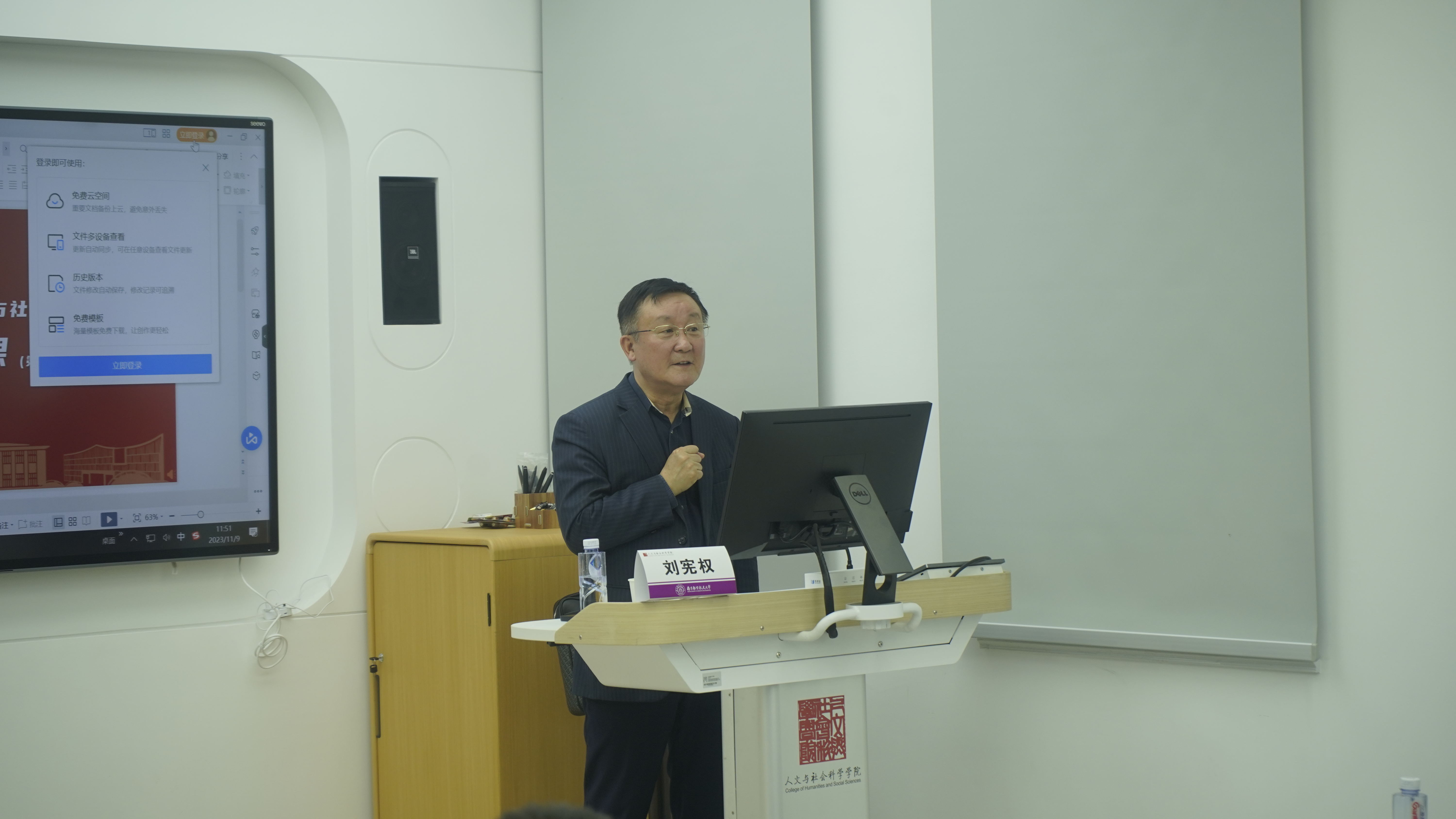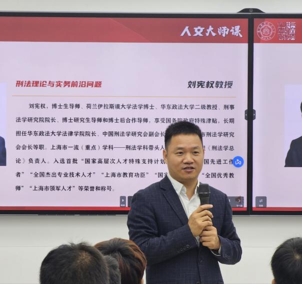 11月9日上午,人文与社会科学学院在院楼213智慧教室开展“人文大师课”专题讲座。本次讲座邀请到华东政法大学刑事法学研究院院长刘宪权教授,就“刑法理论与实务前沿问题 ”问题进行学术交流。学院法律系师生代表参加了本次讲座。讲座由院长高志宏主持。