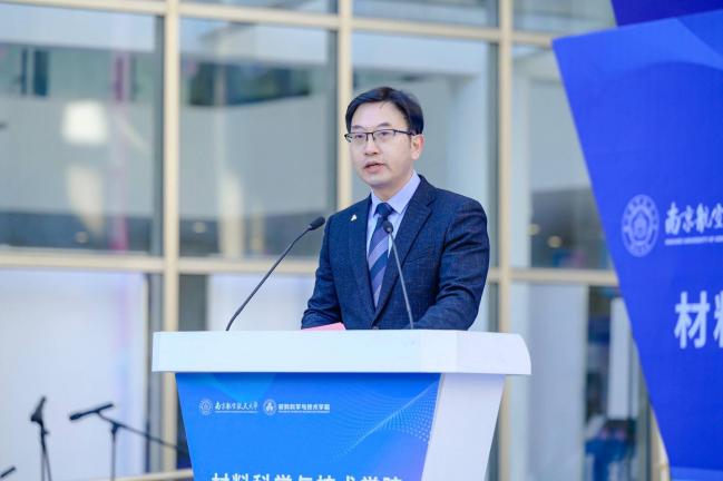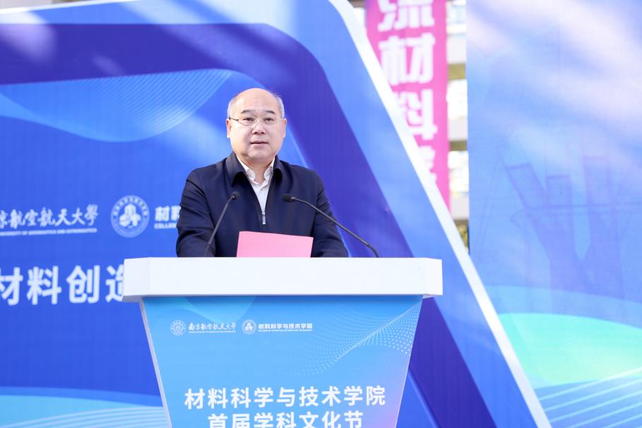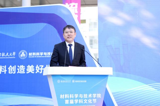 黄志球代表学校对与会领导嘉宾表示热烈欢迎,向关心南航发展、给予材料学院指导支持的校内外各界单位表示感谢,对材料科学学科进入ESI全球前1‰表示祝贺,他简要介绍了近年来学校在航空航天民航领域的办学成效,肯定了学院在人才培养、科学研究、服务国家重大需求等方面取得的成绩。他最后提出三点希望,一是坚持育人为根本,着力创建人才荟萃的材料学院,将学科资源优势转化为人才培养优势;二是坚持学科为龙头,聚力打造特色发展的材料学院,继续紧密围绕“三航”、发展“三航”,持续产出标志性前沿创新成果;三是坚持创新为动力,全力建设矢志一流的材料学院,始终聚焦服务国家重大战略需要,要有“三航急需”“国防急需”“时代急需”的响应度,更要统筹发展和安全两件大事。他鼓励学生以此次学科文化节为契机,感受学科魅力,爱上专业、爱上学习,树立专业自信,勇攀科学高峰。
