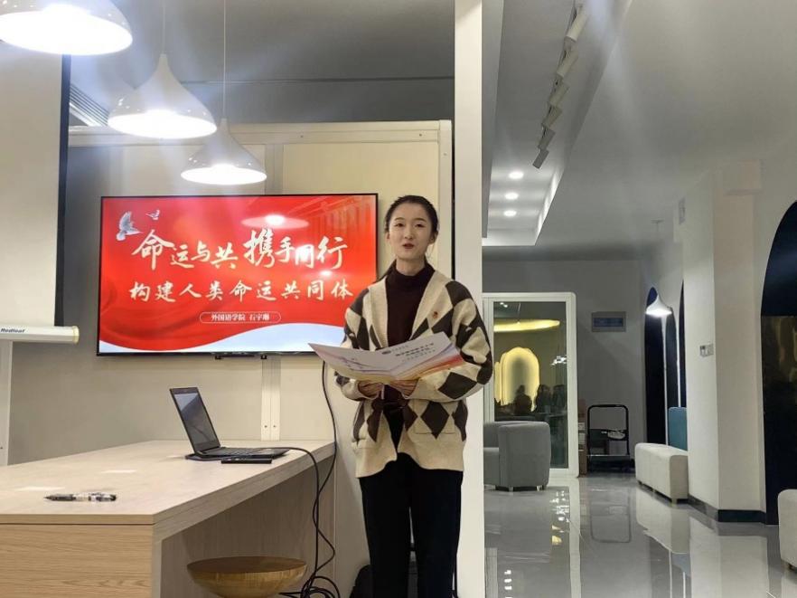 大二团支书石宇琳首先以《命运与共,携手同行——共建人类命运共同体》为题的团课分享。她以一段“卫星眼中人类命运共同体”的小视频引入主题,深入阐述了全球人类命运紧密相连、休戚与共的共同体观念。她从人类命运共同体的四个内涵——国际权利观、共同利益观、可持续发展观和全球治理观的角度分别举例,深入浅出的讲解,使参会同学对人类命运共同体有了更深刻的理解。随后,石宇琳同学联系外国语学院的“Mr.China”实践团队以及模拟联合国项目,提出了自己对外语青年在了解参与国际事务、推动人类命运共同体中应当发挥积极作用的观点。
