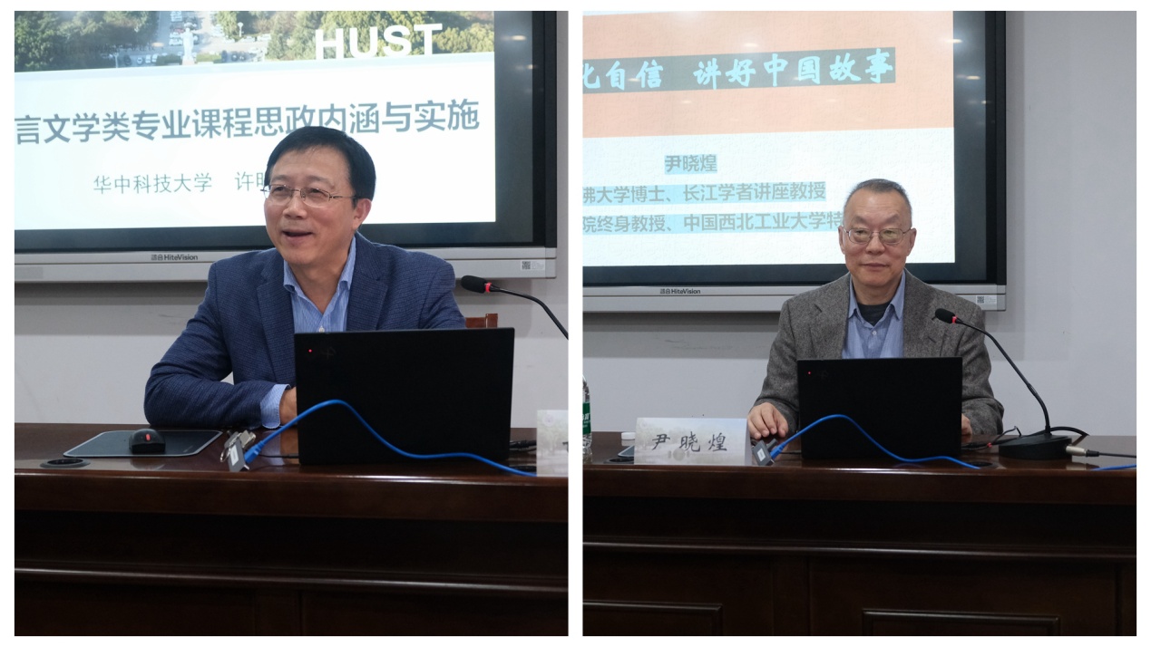 揭牌仪式之后,联盟邀请了华中科技大学外国语学院院长许明武,长江学者讲座教授、西北工业大学外国语学院博导尹晓煌带来了外语课程思政学术报告。线上线下150余人参加了此次报告会。