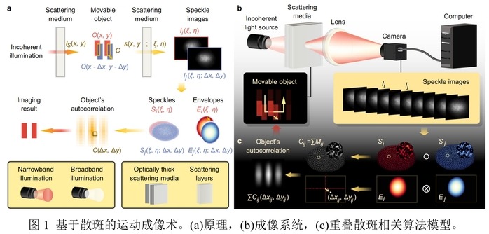 针对上述问题,本工作通过研究目标-散斑的固有关系,提出了一种基于散斑的运动成像术(speckle kinetography),能够有效解决上述问题。该技术通过非侵入拍摄目标运动过程中所产生的一系列散斑图像,利用重叠散斑相关算法(overlapping speckle correlation algorithm)提取散斑图像中固有保留的运动目标重叠度和轨迹信息,以构建目标自相关实现成像。本工作通过实验验证了在单色LED、白光、荧光照明下,对隐藏在各向异性及同性散射介质中的运动目标实现了1 μm分辨率的成像与追踪,且无需任何先验信息、介质厚度可达6倍传输平均自由程。