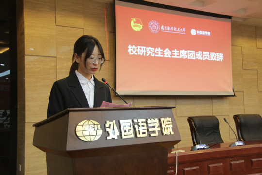 李筱彧、韩颖分别代表校学生会和研究生会对大会的召开表示祝贺。李筱彧表示,青年的未来充满光明,舞台广阔,呼吁同学们要以实际行动践行全心全意服务同学的宗旨,为学院学校建设贡献自己的力量。韩颖则表示,希望外国语学院能继续坚持以学生为本,不断加强内部建设和外部联络,全面打造研究生发展新平台,为同学们的自我实现提供更广阔的空间舞台。
